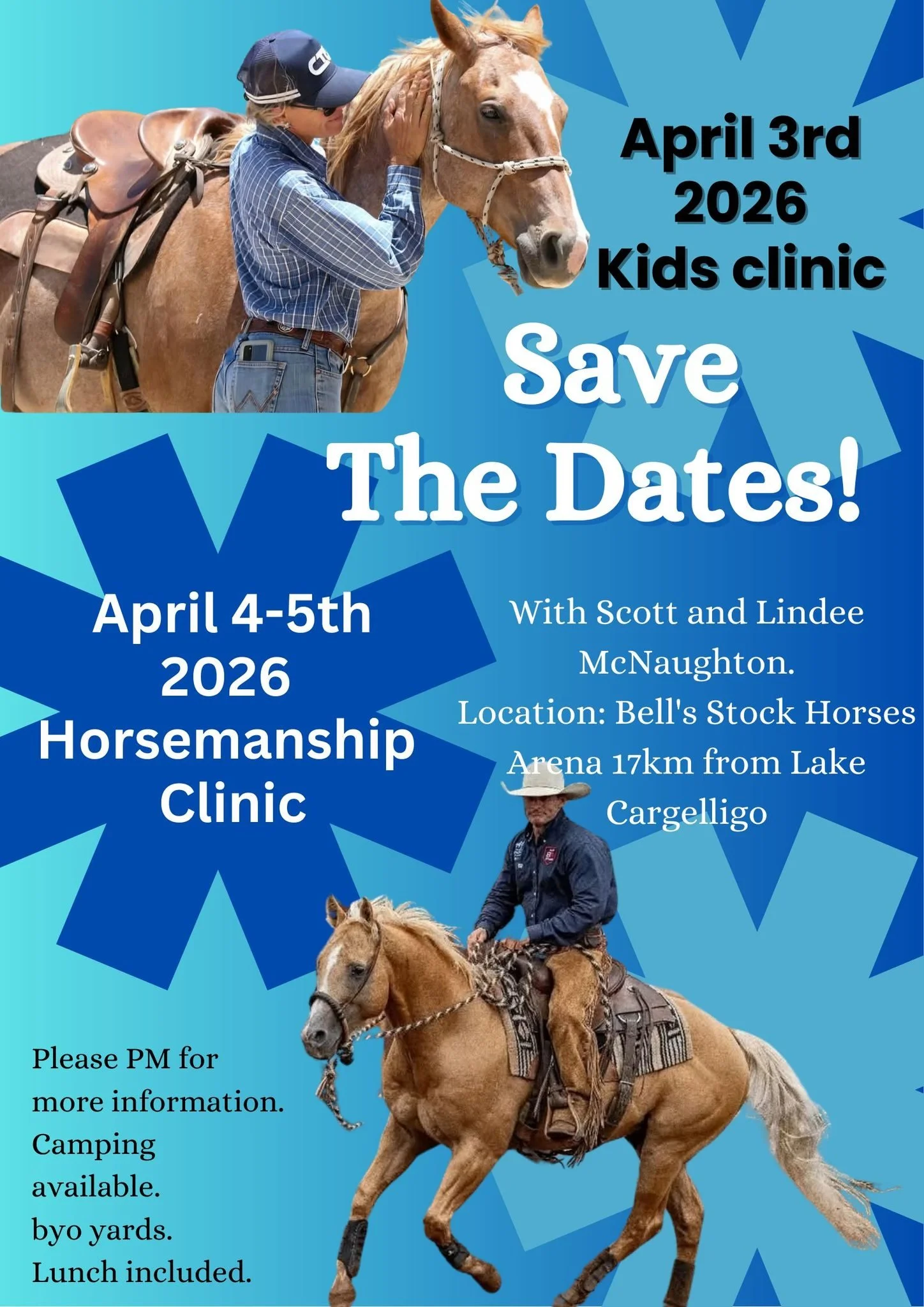 Description: Details to follow. This will be a two day Adult Clinic and a two day Kids Clinic based around working your horse on cattle and solid basics.